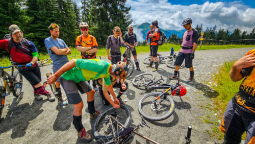 Für jeden etwas zum Üben, in kleinen Gruppen, dabei. Der sogenannte Shuttle sind die Bergbahnen. An einigen Ecken in diesem Sacktal wird bergan getreten, mit dem Analog-Bike sowie mit dem E-Bike. Die unangekündigten Schrauber-Kurse kamen dank einiger „Freiwilliger“ zum Glück auch nicht zu kurz.